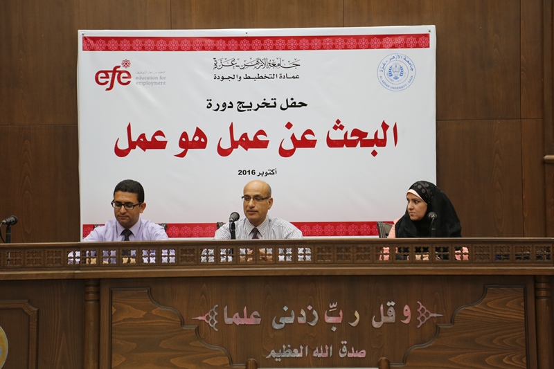 اختتمت عمادة التخطيط والجودة بجامعة الأزهر- غزة والمؤسسة الفلسطينية للتعليم من أجل التوظيف (PEFE) دورة تدريبية بعنوان "البحث عن عمل هو عمل"، وذلك بحضور الاستاذ الدكتور سامي مصلح، والدكتور علي أبو زيد عميد التخطيط والجودة، والأستاذ أحمد سمور مسؤول برامج المؤسسة الفلسطينية للتعليم من أجل التوظيف في غزة، والأستاذة راوية الفرا منسقة التدريب لدى المؤسسة في غزة، وعدد من أعضاء مجلس الجامعة.