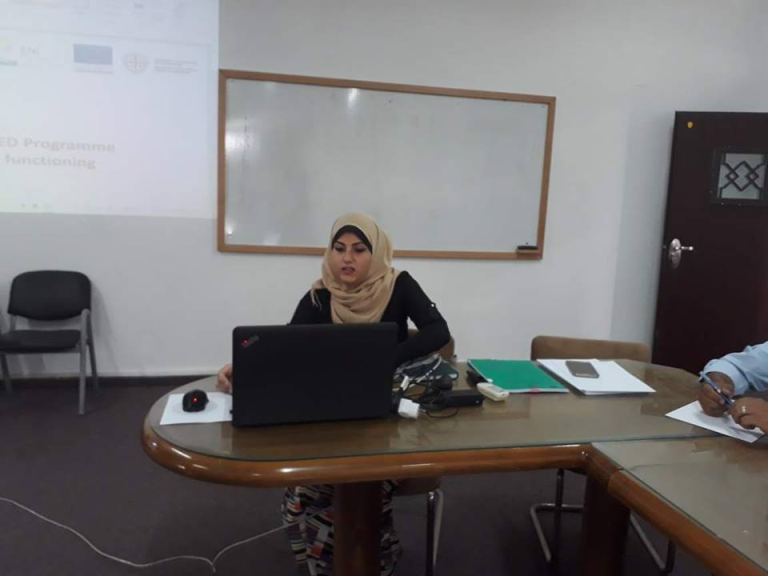 وقدمت المهندسة نسمة السلاق عرضاً لأهداف وأولويات التمويل بالبرنامج وفرص التمويل من برنامج ENI لحوض البحر الابيض المتوسط، أولويات الدعم ومساحات التقاطع للتمويل.
