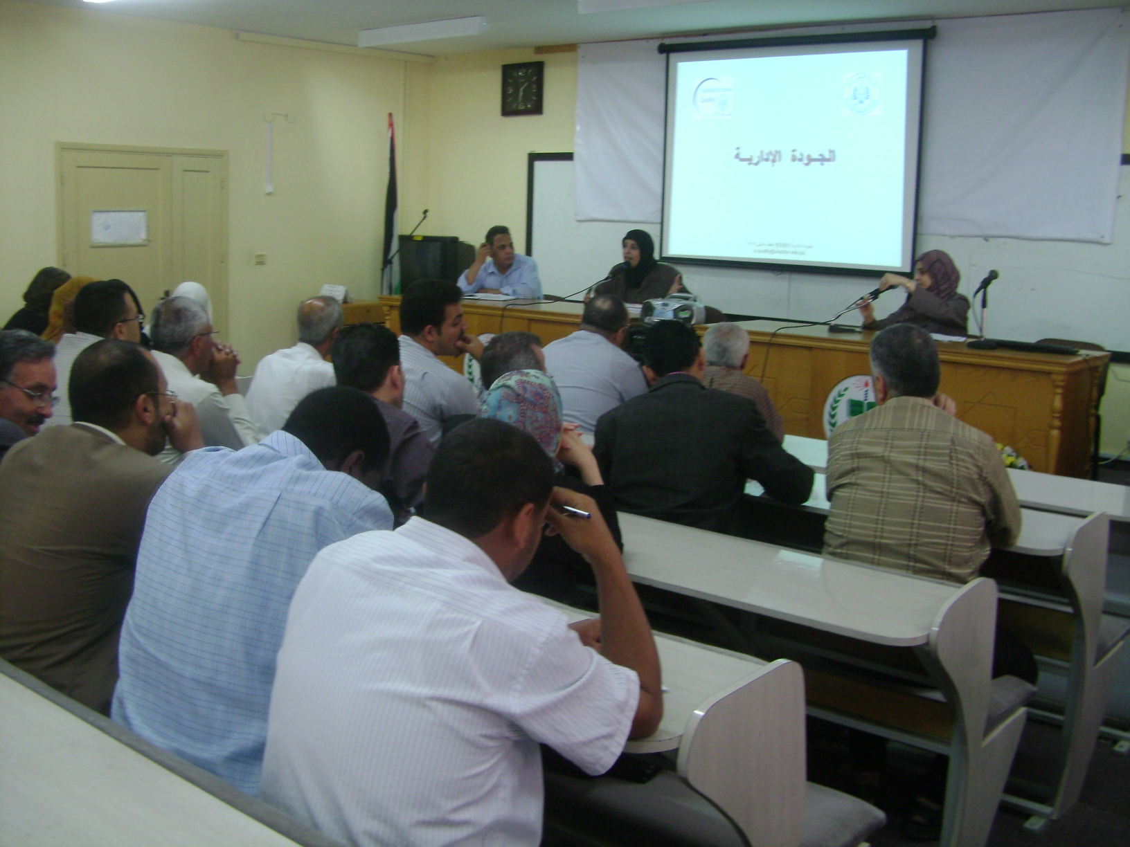 ضمن نشاطات وفعاليات شئون التخطيط والجودة نظمت الجودة الإدارية سلسلة من اللقاءات والاجتماعات مع كافة فئات الموظفين الإداريين بالجامعة في إطار نشر ثقافة الجودة الإدارية حيث استمرت الاجتماعات خمسة أيام على التوالي بدأت في تاريخ22/5/2011 وحتى تاريخ 26/5/2011 وتضمنت هذه الاجتماعات عرضاً مفصلاً لأبرز جوانب الجودة الإدارية وعناصرها والسبل الداعمة لنشرها وتحقيقها داخل الجامعة حيث تم التعريف بالجودة الإدارية وأهدافها الساعية إلى تحسين جودة الخدمات المتاحة للعناصر البشرية في الجامعة وسرعة في العمل ودقة في الأداء وتحديد المهام المتوقعة، ومعاييرها والتأكد على تحديثها وتطويرها بما سيهم في تطوير الأداء العام للموظفين الإداريين كما تناول العرض الأنشطة المختلفة للجودة الإدارية بالإضافة إلى التعريف بهيكلية الجودة الإدارية ولجانها المختلفة والمهام المنوطة بكل لجنة.