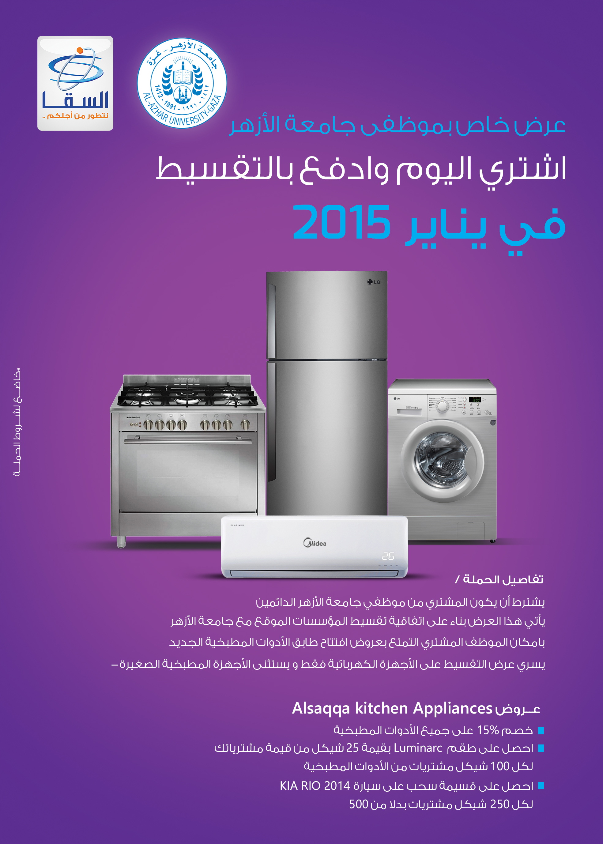 الموضوع / أسبوع تسوق خاص لموظفي جامعة الأزهر بالإشارة للموضوع أعلاه مرفق العرض الخاص بأسبوع التسوق حيث يبدأ من يوم السبت المقبل بتاريخ 18/10/2014 – الخميس 23/10/2014 العروض : - أشتري الآن وأدفع القسط الأول في يناير 2015 لكل من (مكيف ، ثلاجة ، غسالة ، فرن بوتاجاز ) - عروض افتتاح معرض السقا كتشن للأدوات المطبخية : · اشتري ب 250 بدل 500 من الأدوات المطبخية وأدخل السحب على سيارة كيا ريو2014 · أحصل على هدية طقم LUMINARC بقيمة 25 شيكل لكل 100 شيكل مشتريات من الأدوات المطبخية · خصم 15 % على جميع مشترياتك من الأدوات المطبخية ملاحظة : تصفح المرفق الموجود بالرسالة يسري عرض التقسيط على الأجهزة الكهربائية فقط ولا يشمل الأدوات المطبخية