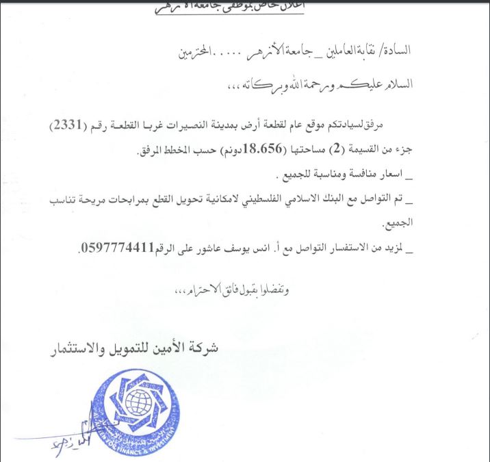 اعلان بخصوص شراء اراضي - شركة الأمين