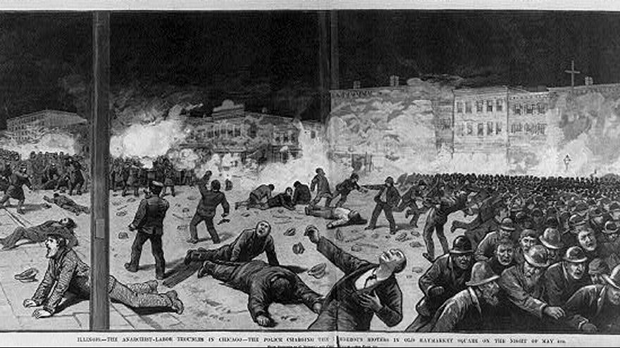 وفي يوم 1 مايو من عام 1886 نظم العمال في شيكاغو ومن ثم في تورنتو إضرابا عن العمل شارك فيه ما بين 350 و 400 ألف عامل، يطالبون فيه بتحديد ساعات العمل تحت شعار "ثماني ساعات عمل، ثماني ساعات نوم، ثماني ساعات فراغ للراحة والاستمتاع" ، الأمر الذي لم يَرق للسلطات وأصحاب المعامل خصوصا وأن الدعوة للإضراب حققت نجاحا جيدا وشلت الحركة الاقتصادية في المدينة، ففتحت الشرطة النار على المتظاهرين وقتلت عدداً منهم، ثم ألقى مجهول قنبلة في وسط تجمع للشرطة أدى إلى مقتل 11 شخصا بينهم 7 من رجال الشرطة واعتُقِلَ على إثر ذلك العديد من قادة العمال وحكم على 4 منهم بالإعدام، وعلى الآخرين بالسجن لفترات مُتفاوتة.