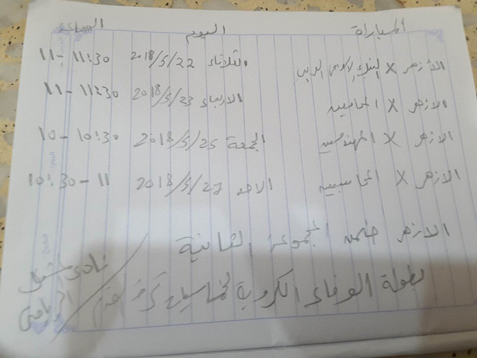 يشارك فريق العاملين لكرة القدم في بطولة الوفاء الكروية التي ينظمها ندي المشتل الرياضي على ملعبه بمناسبة شهر رمضان المبارك اعاده الله علينا وعليكم جميعا باليمن والخير والبركات. ومن المقرر أن يلتقي فريق العاملين في اولى مبارياته فريق العاملين في البنك الاسلامي العربي على ارض ملعب نادي المشتل الرياضي الساعة 11 مساء يوم الثلاثاء 22/5/2018. ويقع فريق العاملين ضمن المجموعة الثانية والتي تضم كل من فريق العاملين في: البنك الاسلامي العربي، المحامين، المهندسين، المحاسبين. ومرفق جدول مباريات البطولة، وملخص مباريات الازهر. وبهذه المناسبة نتقدم للعاملين بكل ايات الشكر والتقدير على دعمهم المتواصل لجهود فريق العاملين لكرة القدم، وعليه نتطلع الى الحضور المشاركة والدعم والمؤازرة للفريق في جميع المباريات التي يخوضها فريق العاملين لكرة القدم. حضوركم يشد من أزر الفريق، ويحفزه على العمل بكل قوة لتقديم الافضل دائما. عاش ازهرنا شامخ، واعطر التحيات لكم.
