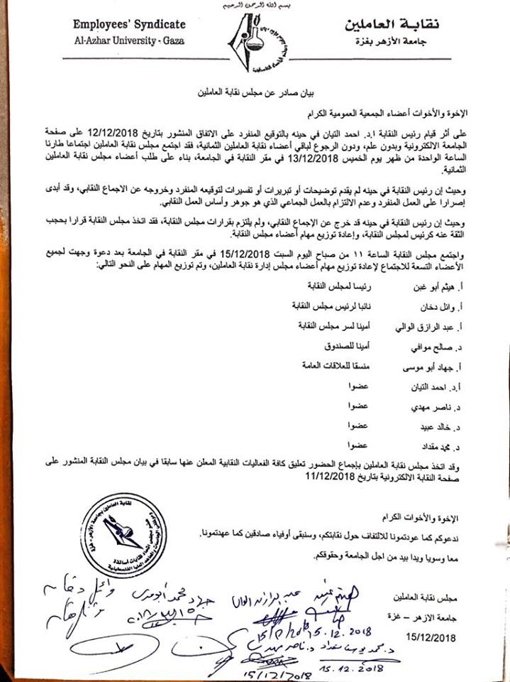 بيان صادر عن مجلس نقابة العاملين الإخوة والأخوات أعضاء الجمعية العمومية الكرام على أثر قيام رئيس النقابة ا.د. احمد التيان في حينه بالتوقيع المنفرد على الاتفاق المنشور بتاريخ 12/12/2018 على صفحة الجامعة الالكترونية وبدون علم، ودون الرجوع لباقي أعضاء نقابة العاملين الثمانية، فقد اجتمع مجلس نقابة العاملين اجتماعا طارئا الساعة الواحدة من ظهر يوم الخميس 13/12/2018 في مقر النقابة في الجامعة، بناء على طلب أعضاء مجلس نقابة العاملين الثمانية. وحيث إن رئيس النقابة في حينه لم يقدم توضيحات أو تبريرات أو تفسيرات لتوقيعه المنفرد وخروجه عن الاجماع النقابي، وقد أبدى إصرارا على العمل المنفرد وعدم الالتزام بالعمل الجماعي الذي هو جوهر وأساس العمل النقابي. وحيث إن رئيس النقابة في حينه قد خرج عن الإجماع النقابي، ولم يلتزم بقرارات مجلس النقابة، فقد اتخذ مجلس النقابة قرارا بحجب الثقة عنه كرئيس لمجلس النقابة، وإعادة توزيع مهام أعضاء مجلس النقابة. واجتمع مجلس النقابة الساعة 11 من صباح اليوم السبت 15/12/2018 في مقر النقابة في الجامعة بعد دعوة وجهت لجميع الأعضاء التسعة للاجتماع لإعادة توزيع مهام أعضاء مجلس إدارة نقابة العاملين، وتم توزيع المهام على النحو التالي: أ. هيثم أبو غبن رئيسا لمجلس النقابة أ. وائل دخان نائبا لرئيس مجلس النقابة أ. عبد الرازق الوالي أمينا لسر مجلس النقابة د. صالح موافي أمينا للصندوق أ. جهاد أبو موسى منسقا للعلاقات العامة أ.د. احمد التيان عضوا د. ناصر مهدي عضوا د. خالد عبيد عضوا د. محمد مقداد عضوا وقد اتخذ مجلس نقابة العاملين بإجماع الحضور تعليق كافة الفعاليات النقابية المعلن عنها سابقا في بيان مجلس النقابة المنشور على صفحة النقابة الالكترونية بتاريخ 11/12/2018 الإخوة والأخوات الكرام ندعوكم كما عودتمونا للالتفاف حول نقابتكم، وسنبقى أوفياء صادقين كما عهدتمونا. معا وسويا ويدا بيد من اجل الجامعة وحقوقكم. مجلس نقابة العاملين جامعة الازهر – غزة 15/12/2018