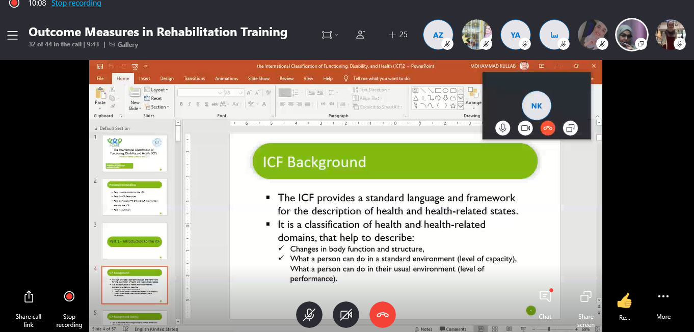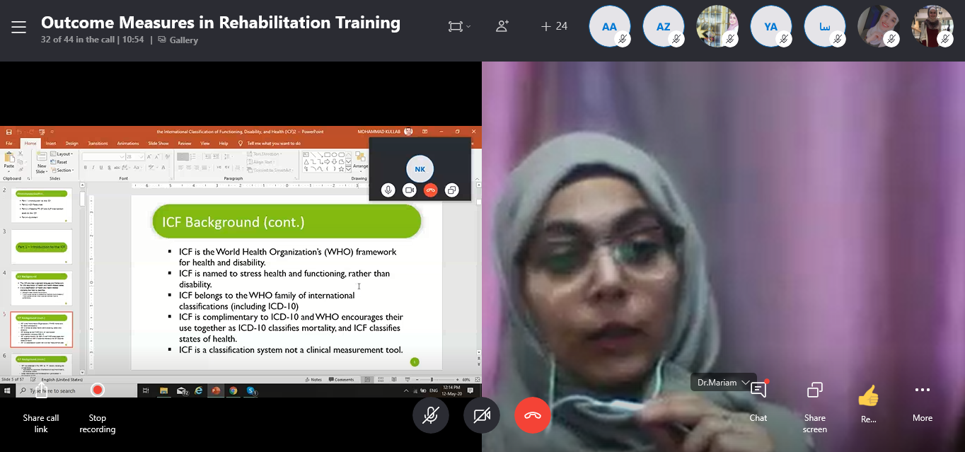 i-CARE project conducted a virtual workshop entitled with ICF & the Outcome measures in Rehabilitation, it's targeted PT and engineering students from the local universities by Dr Suad Ghaben and Dr Maryam Muhanna.