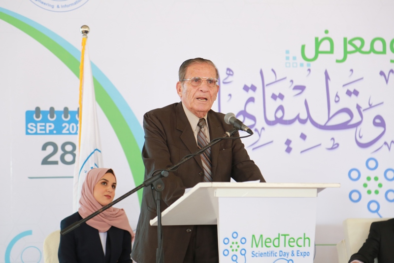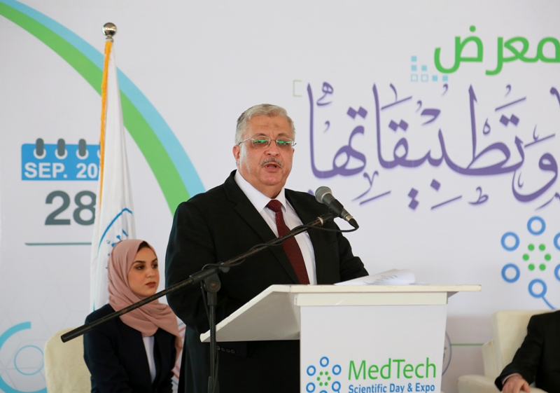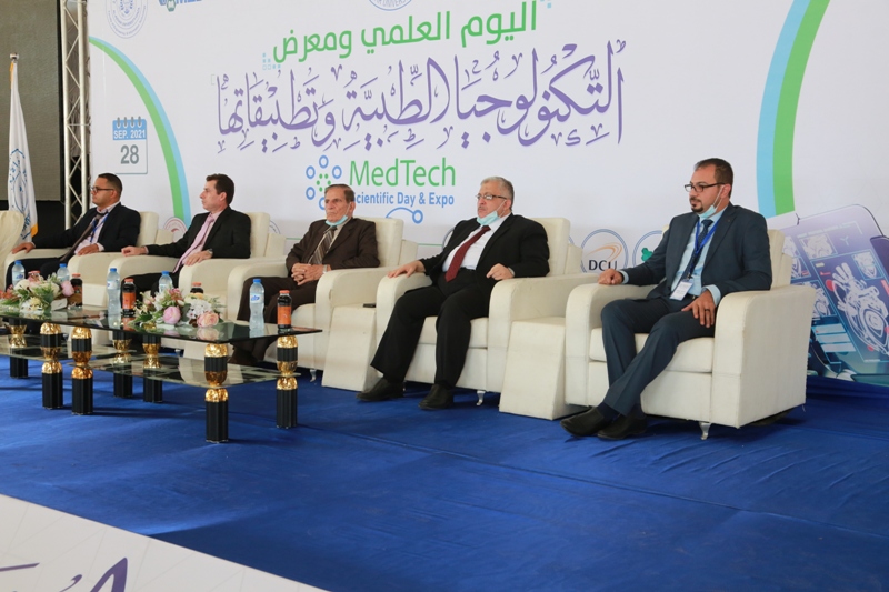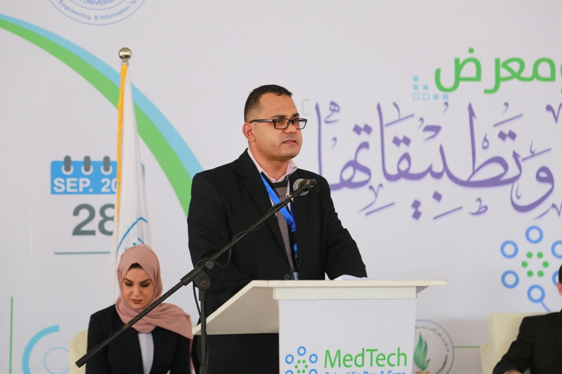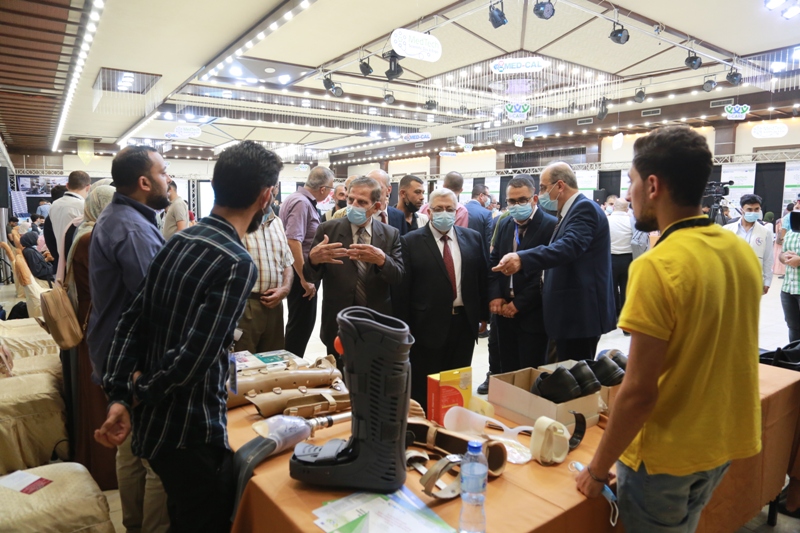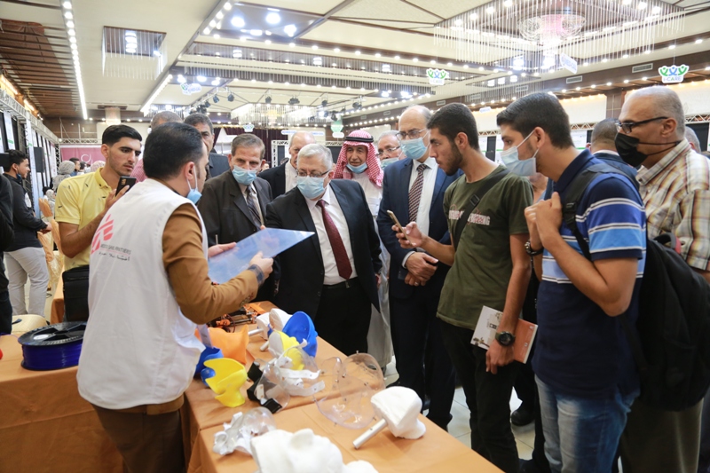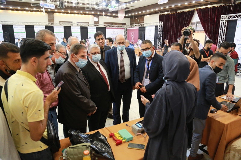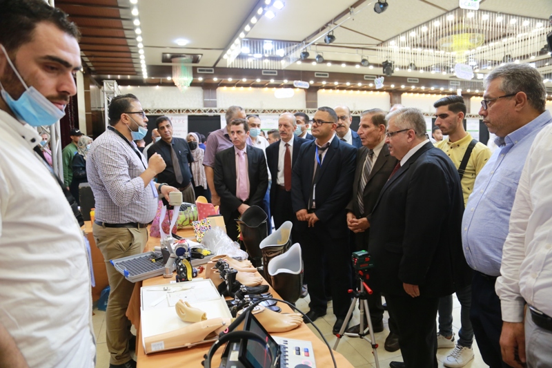 After the closing ceremony of the scientific day, the audience went to cut the ribbon for the opening of the exhibition, which was organized in one of the halls with the participation of (28) projects submitted by students and graduates of the College of Engineering and Information Technology and Medicals faculties, and with the participation of many private and public sector institutions represented by Hamad Hospital for Prosthetics, the Center for Prosthetics, and Kimball Company The exhibition included innovative ideas and advanced equipment in medical equipment engineering and its applications.